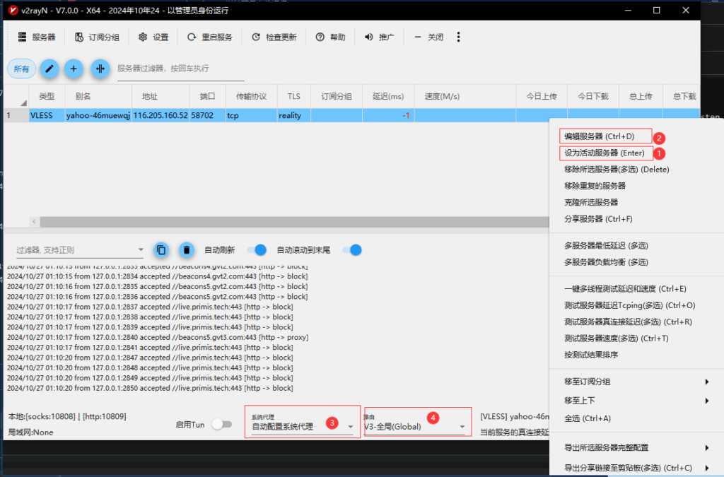 这里不用管,后续到了配置代理的时候在选择。主界面会显示一些信息:x-ui版本/IP地址/xray版本切换/瞬时网络流量/总共用了多少流量/连接数等等,方便查看。